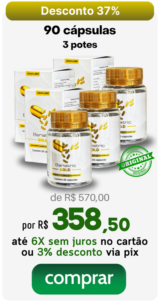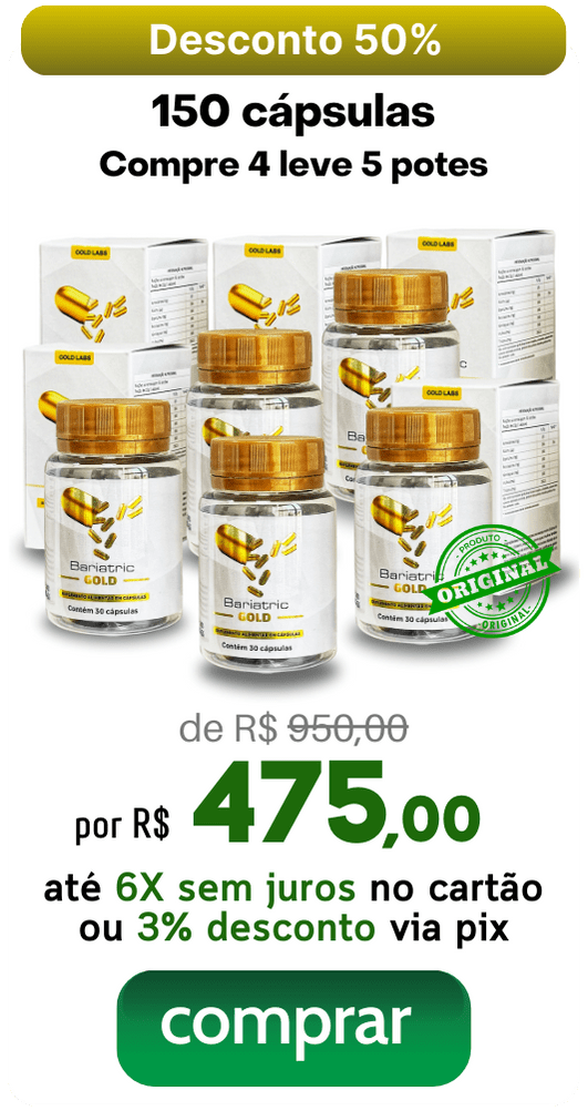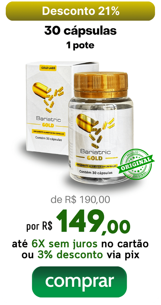 Bariatric Gold é um composto formulado com ingredientes naturais que estimula o metabolismo, promove saciedade ao reduzir o apetite, desintoxica o organismo, regula o funcionamento intestinal e diminui a retenção de líquidos, potencializando os resultados no emagrecimento e na redução do inchaço corporal.