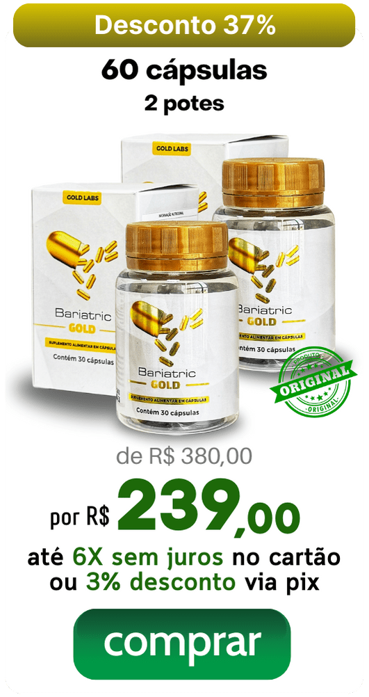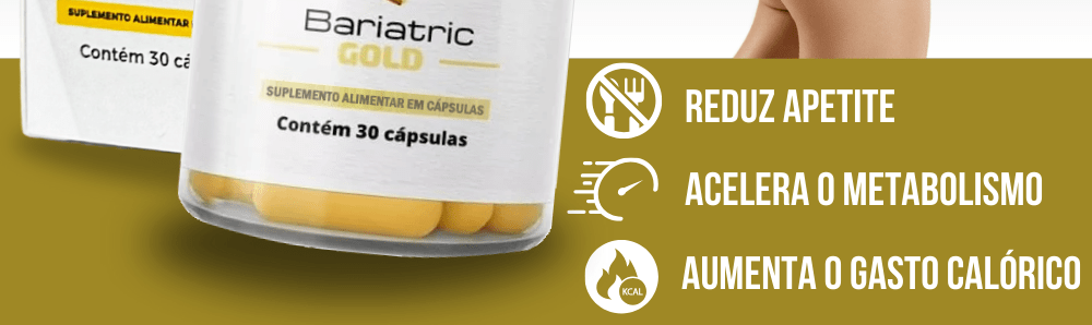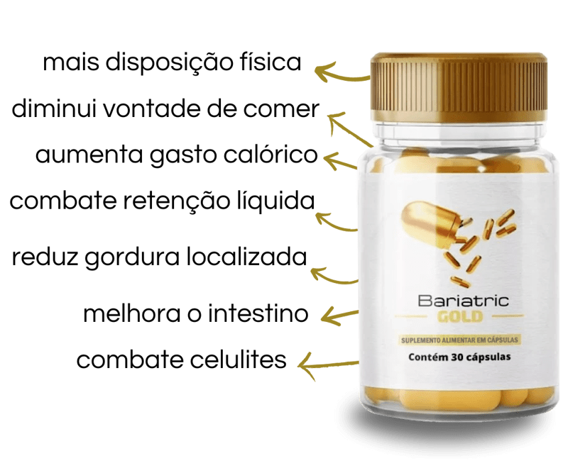 Bariatric Gold é um composto formulado com ingredientes naturais que estimula o metabolismo, promove saciedade ao reduzir o apetite, desintoxica o organismo, regula o funcionamento intestinal e diminui a retenção de líquidos, potencializando os resultados no emagrecimento e na redução do inchaço corporal.
